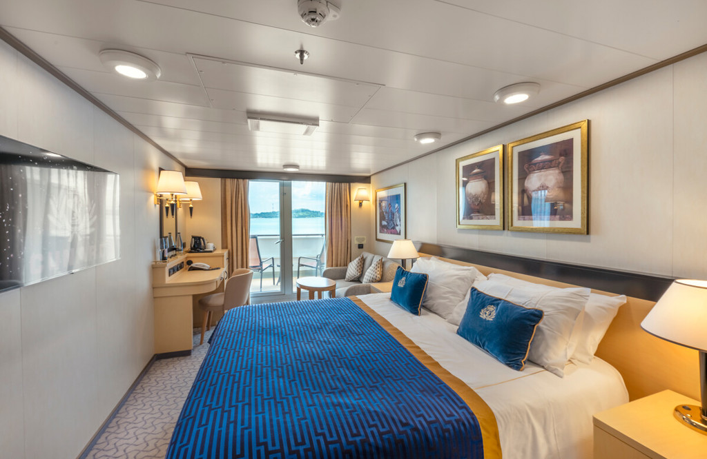 Enjoy the view from your private balcony and the comfort of your luxurious interior as you relax in your well appointed stateroom. The Britannia Balcony staterooms have two beds, a shower, living area and balcony.