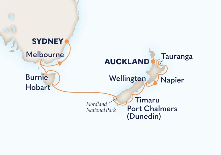 Set sail from Auckland along our stunning coastline, visiting charming towns and vibrant cities. Soak in the beauty of ethereal Fiordland National Park before crossing the Tasman Sea to enjoy the amenities and entertainment onboard. Discover one of the world's finest contemporary art museums in Hobart, shop in Melbourne, and sail into the iconic Sydney harbour, where you'll relish extra time ashore with a hotel stay before your flight.