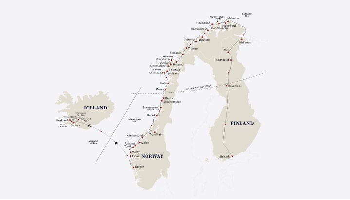 From Finland’s icy forests to Iceland’s volcanic shores, this journey offers a breathtaking passage through the wild heart of the North. Traverse the snowy landscapes of Lapland, cross into Norway’s dramatic fjords and Arctic towns, then continue across the North Atlantic to Iceland’s black-sand beaches and geothermal wonders. Each stop—from the quiet magic of Saariselkä to the surreal beauty of Vík—unfolds a new chapter in a region shaped by nature, myth, and timeless Nordic spirit.