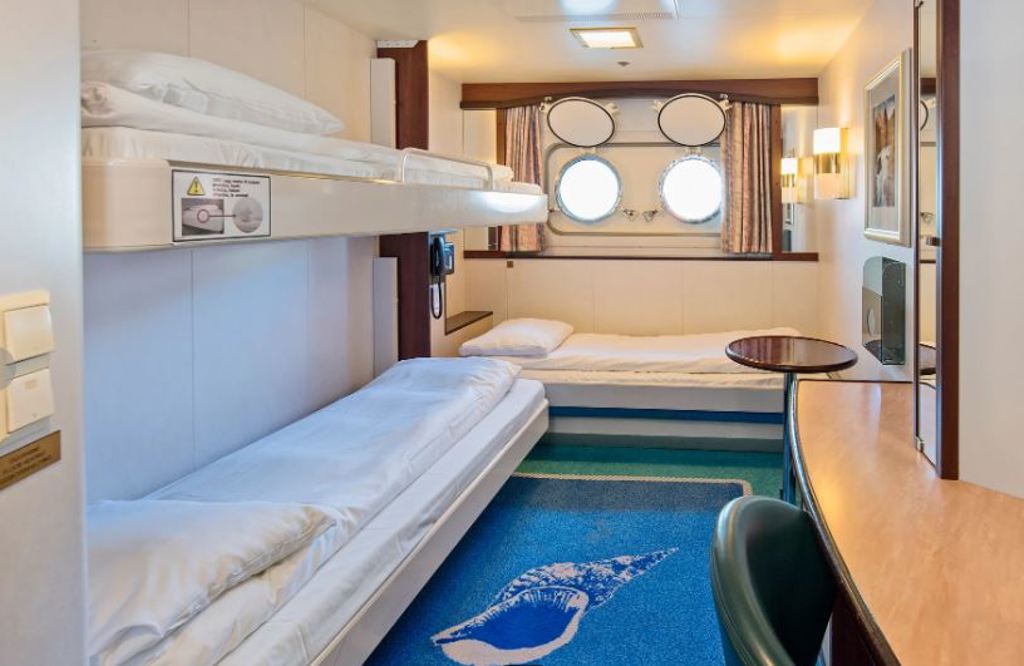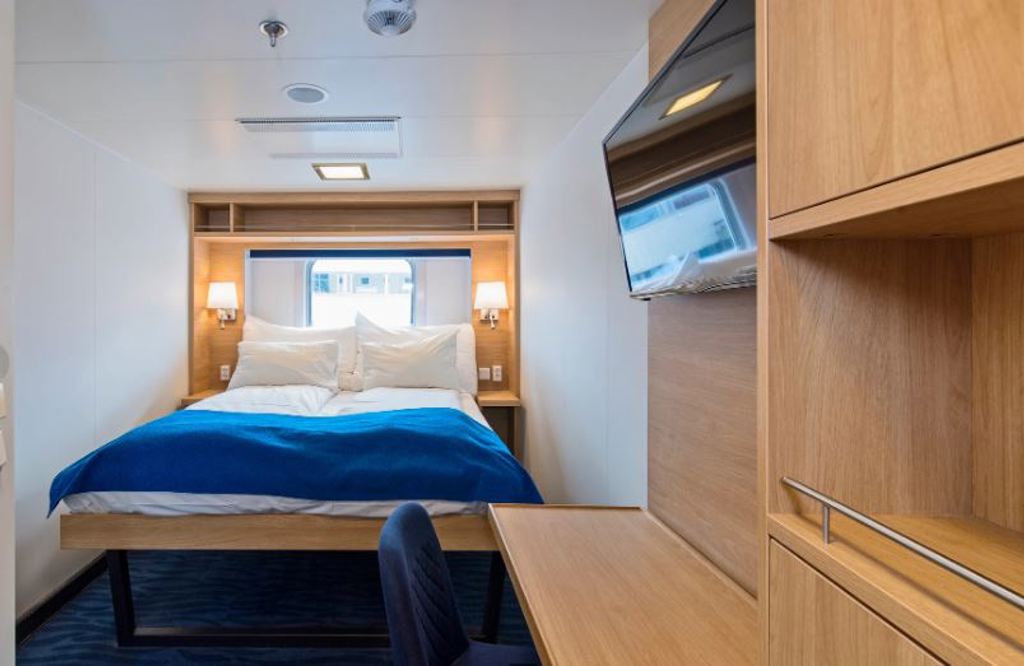 Polar Outside cabins feature all the same amenities as Polar Inside cabins, plus a porthole or window offering a full or limited view. With flexible bed setups and compact seating, they strike an ideal balance between comfort and value. Selected cabins can accommodate a baby crib and include a small seating area, making them a good option for families. Please note that some cabins may experience noise or vibration at night.