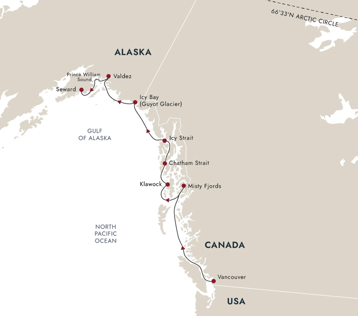 Join us on an adventure from Vancouver to Seward as we venture deep into Prince William Sound, showing you majestic scenery, traditional Alaskan culture and temperate rainforest wildlife. We’ll sail the Inside Passage and the Alaskan Panhandle, noted for their deep fjords, icy glaciers and towering mountains. As we sail, we’ll be on the lookout for whales and orcas, as well as shore animals including bears and moose.