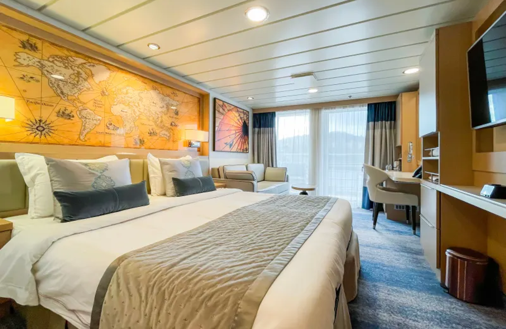 Located throughout the ship and approximately 205 sq. ft. (19.2 sq. m,) in size, these cabins have one double bed that can be configured into two singles, and seperate sitting area furnished with a sofa-bed. There is a floor to ceiling glass view that opens to a walkout balcony. There is also a desk and chair, TV, state of the art 'infotainment' system and private bathroom with shower, vanity and heated floor.