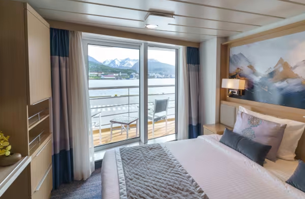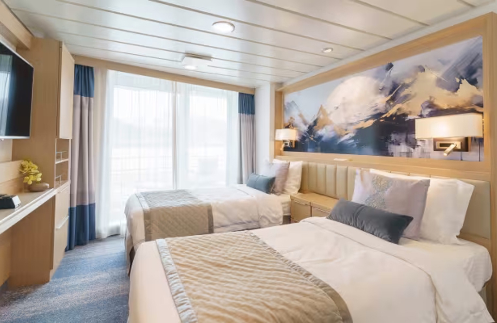 Located on Deck 4 and approximately 182 sq. f. (16.9 sq. m,) in size, these cabins have one double bed that can be configured into two singles. There is a floor to ceiling glass view that opens to a walkout balcony. There is also a desk and chair, TV, state of the art 'infotainment' system and private bathroom with shower, vanity and heated floor.