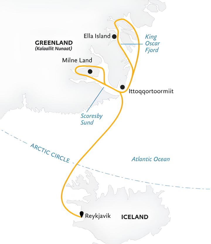 Explore two of the last unspoiled wilderness areas on the planet with the Under the Northern Lights: Exploring Iceland & East Greenland itinerary. Cruising along Iceland’s mountainous Vestfjords and Greenland’s remote northeast coast, home to the largest fjord system in the world, you’ll discover diverse and dramatically rugged landscapes rich in iconic arctic wildlife. Immersed in the untamed beauty of the Arctic, you’ll experience Inuit culture firsthand at Ittoqqortoormiit, visit ancient Thule sites steeped in history, and marvel at the majesty of massive icebergs and towering bird cliffs. If you’re lucky, you may also catch sight of the spectacular northern lights dancing across the sky.