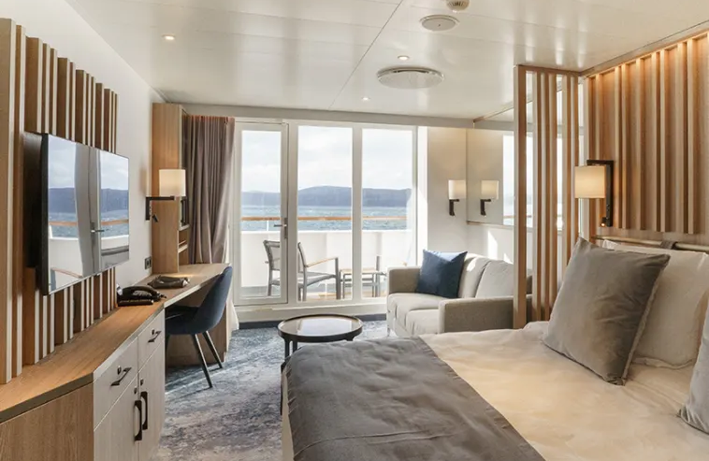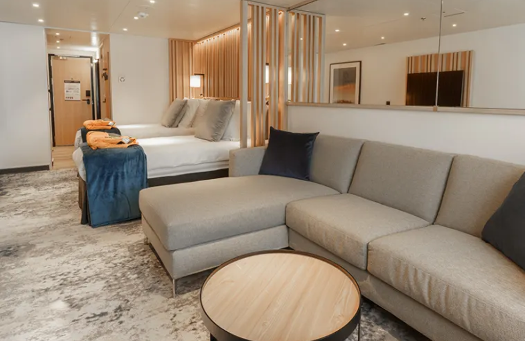 Located on Decks 4 and 6, with approximately 226 sq. ft. (21 m2) of indoor living space, and a 52 sq. ft. (4.8 m2) balcony, this entry-level balcony suite is one of the largest available on a ship of this class. This suite is perfect for guests who are looking for both indoor and outdoor living spaces. There are four connecting suites in this category, making this an excellent option for families or groups wanting to stay connected to each other during their expedition.