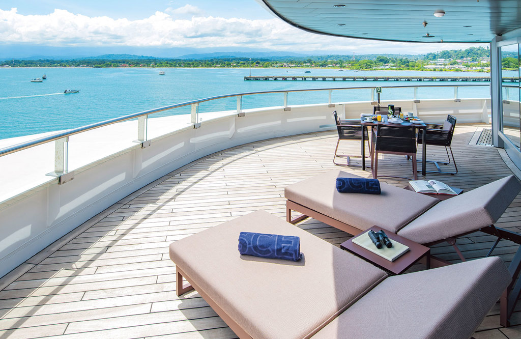 The Grand Panorama Suite offers sweeping ocean views from an expansive private verandah, elegant living and dining areas, and a king-size Scenic Slumber Bed. A spacious bathroom with spa bath and separate shower, plus personalized butler service, ensures an indulgent ultra-luxury experience at sea.