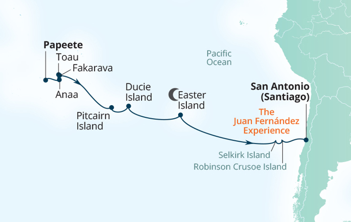 Set sail from Tahiti with Seabourn and uncover remote destinations, abundant marine life, and rich history - from the stunningly beautiful lagoons of French Polynesia and the intriguing legends of Pitcairn Island to the enigmatic Moai statues of Easter Island and featuring an immersive two-day Juan Fernández (Robinson Crusoe) Experience.