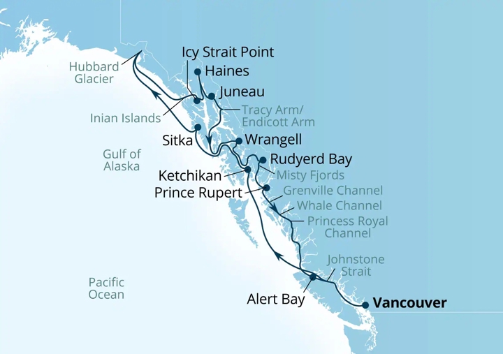 Begin your journey with a two-night stay in vibrant Vancouver, exploring highlights such as Stanley Park and Granville Island Public Market. Then board the ultra-luxury Seabourn Encore and sail towards pristine Alaska, where frontier towns like Ketchikan and Wrangell, the majestic Hubbard Glacier, and the wild beauty of Misty Fjords await. The Seabourn Elite Expedition Team will host engaging Seabourn Conversations on marine biology, geology, history, and photography, with Naturalist Experts sharing insights into local bears, whales, and other endemic wildlife.