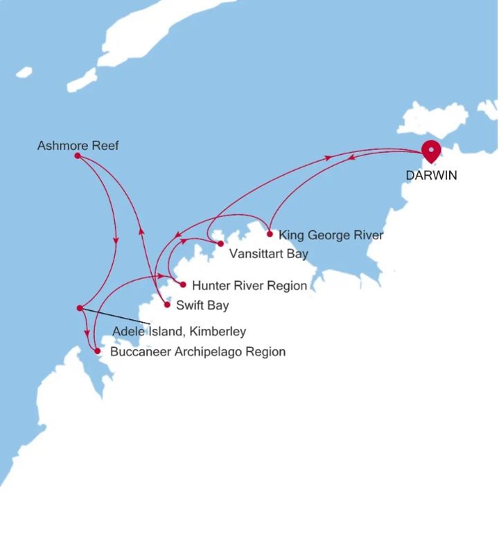 Darwin bookends 10 nights of far-flung adventure amid the natural set pieces of the Kimberley Coast. Feel the spray from roaring twin waterfalls, and snorkel kaleidoscopic reefs, before river Zodiac adventures - their expert expedition team are ready to enhance your explorations. Encounter ancient rock art, land on distant islands of sublime marine life, and witness the churning power of the Horizontal Falls - all part of the ultimate Aussie adventure.