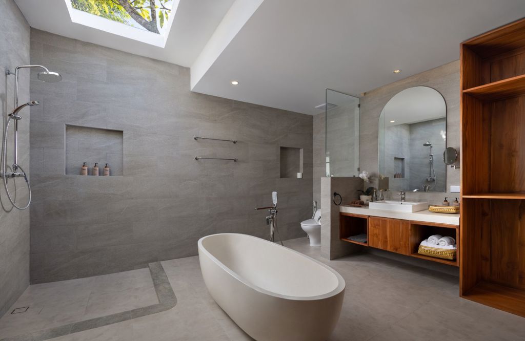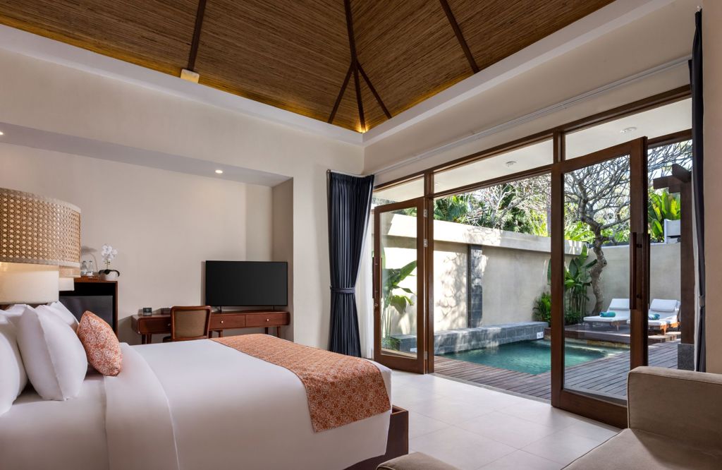 This exclusive villa offers a spacious bedroom with Balinese charm, a luxurious en-suite with a bathtub and rain shower, and a private pool surrounded by tropical greenery.