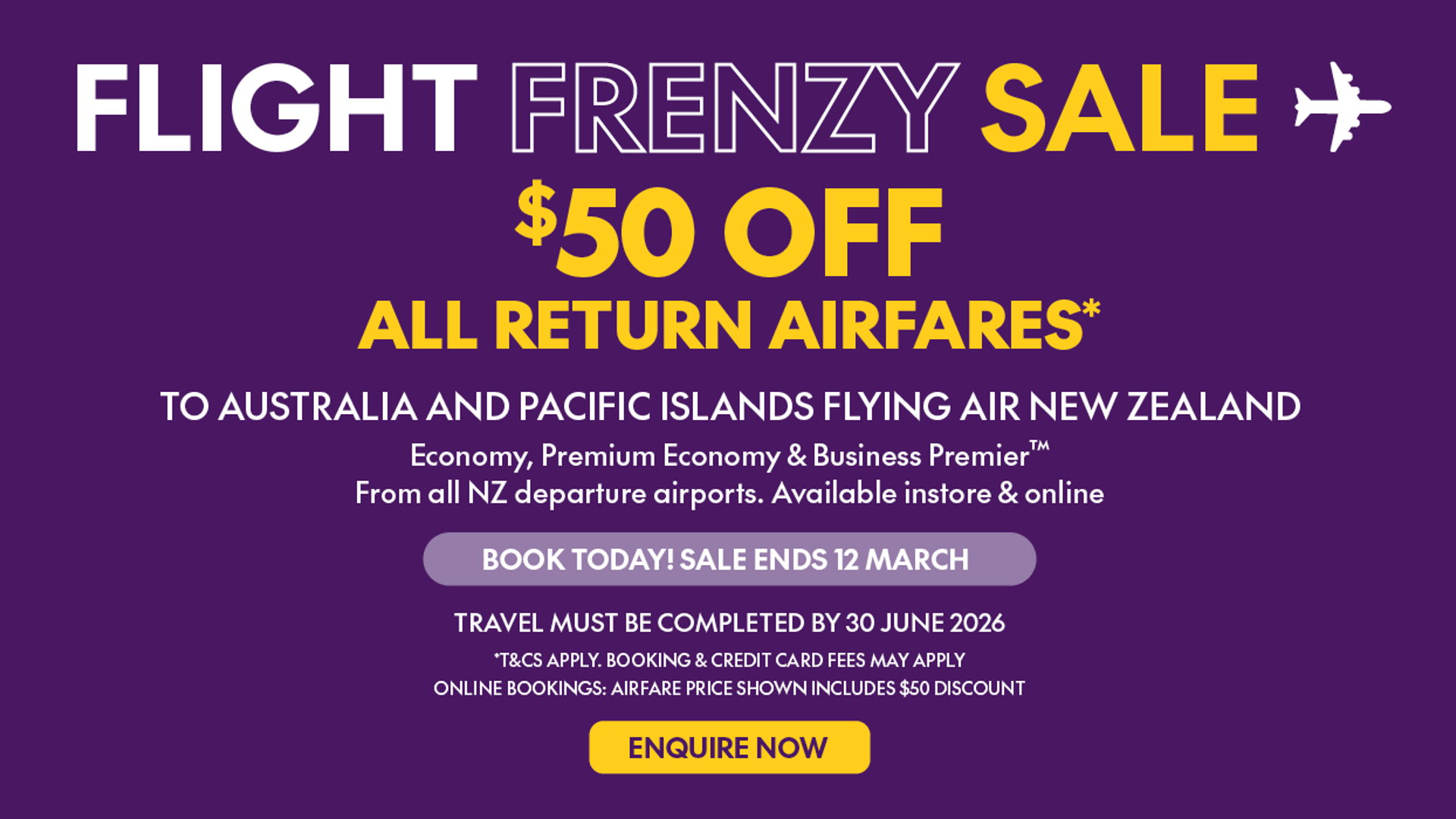 For 4 days only, SAVE $50 off per person off all return Air New Zealand flights* to Australia and the Pacific Islands.