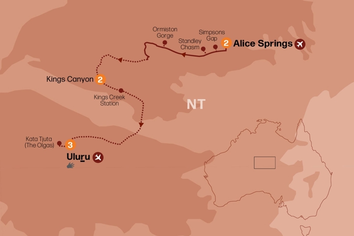 Today, we say goodbye to Alice Springs and go deeper into the outback. Our first stop is Ellery Creek, where we'll enjoy a short walk and morning tea. Next, we head to Ormiston Gorge to admire its towering red cliffs and stop for lunch before continuing our journey to the majestic Kings Canyon and Watarrka National Park.