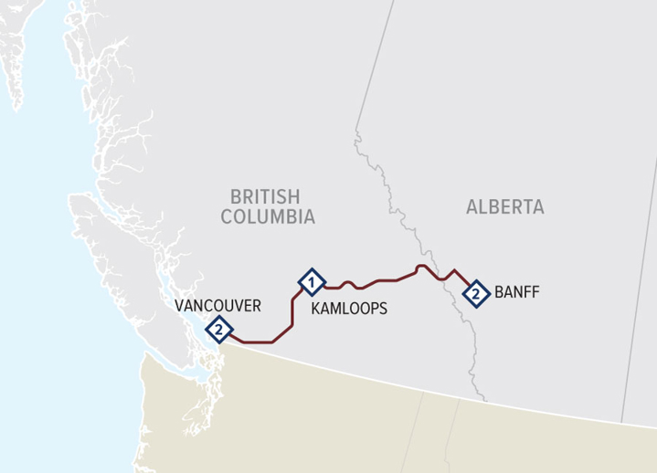 Departing early in the morning, travel onboard Rocky Mountaineer from the coastal city of Vancouver to Kamloops, located in the heart of British Columbia's interior. On today's journey, you will see dramatic changes in scenery, from the lush green fields of the Fraser Valley, through forests and winding river canyons surrounded by the peaks of the Coast and Cascade Mountains, to the desert-like landscapes of the BC interior. Highlights include the rushing waters of Hell's Gate in the Fraser Canyon and the steep slopes and rock sheds along the Thompson River. Your day ends in the evening as the train travels along the shores of Kamloops Lake into the town of Kamloops. Overnight in Kamloops. B, L.