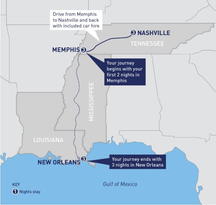 - 9 nights hotel accommodation (3 nights Memphis, 3 nights Nashville, 3 nights New Orleans)