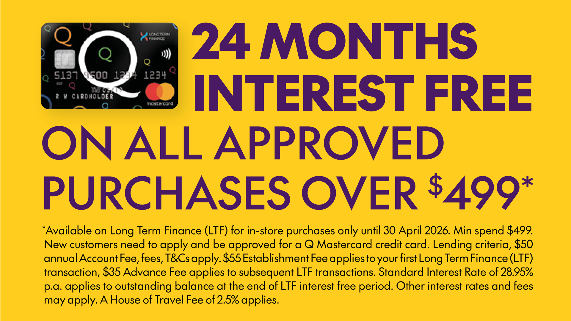 *Available on Long Term Finance (LTF) for in-store purchases only until 30 April 2026. Min Spend $499. New customers need to apply and be approved for a Q Mastercard credit card. Lending criteria, $50 annual Account Fee, fees, Ts&Cs and exclusions apply. $55 Establishment Fee applies to your first Long Term Finance (LTF) transaction, $35 Advance Fee applies to subsequent LTF transactions. Standard Interest Rate of 28.95% p.a. applies after Interest Free period. Other interest rates and fees may apply. Visit www.qcard.co.nz. A 2.5% House of Travel fee applies.
